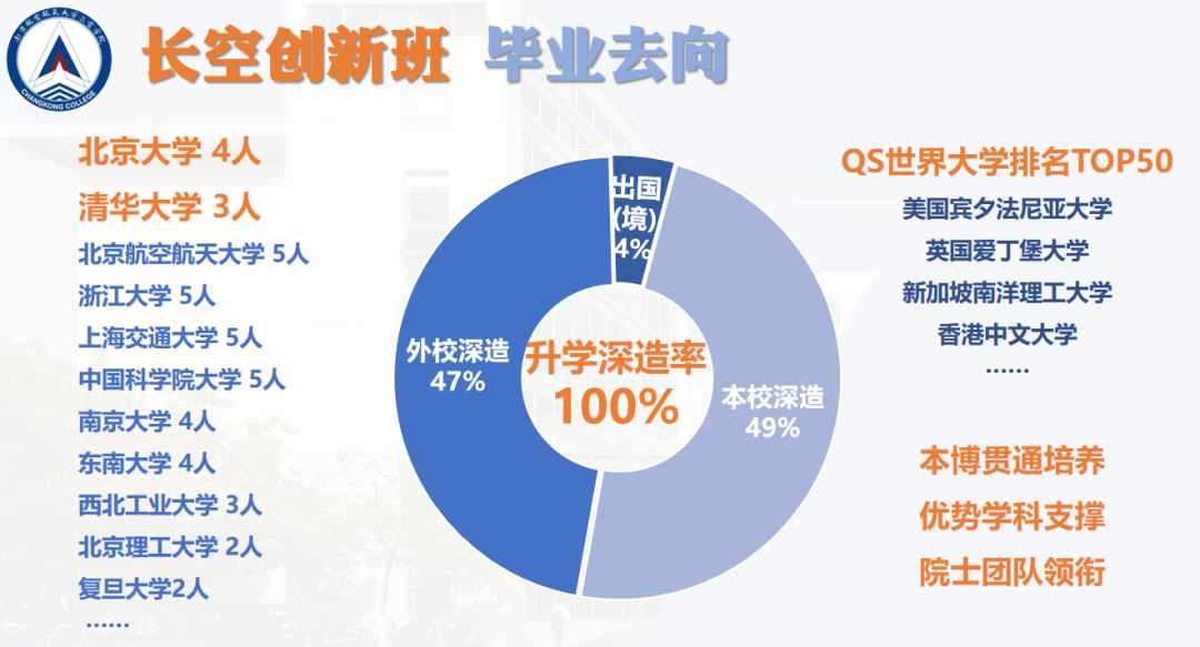 近两年,通过在班资格考核的长空创新班毕业生升学深造率达100%,53人保送本校深造(32人入选学校本博贯通培养计划),研究生导师均分布于我校优势学科下的院士团队或百强创新团队;51人保送清华大学、北京大学、北京航空航天大学等国内知名高校,5人赴美国宾夕法尼亚大学、新加坡南洋理工大学、英国爱丁堡大学等QS排名前50的海(境)外名校深造。