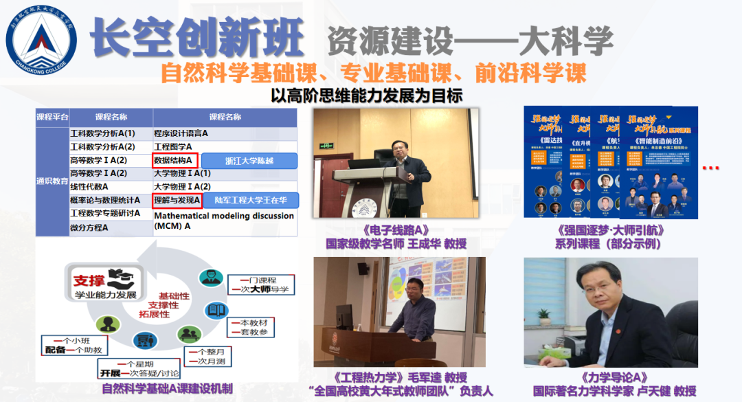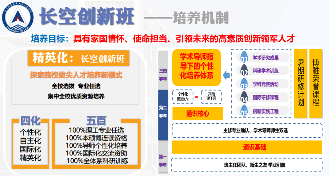 长空创新班汇聚全校优势资源,每年招收80名左右学生,围绕拔尖创新人才成长的核心要素,突出数理基础、智能计算基础和多学科交叉知识,推行集“学习知识、培养能力、激发智慧”三位一体的研究型教学,构建以“强调心智健全、突出自主学习、关注发展潜能”的选拔机制,实行以学术成果和科研水平为导向的荣誉评价体系,选配院士、国家级人才、校友总师、行业精英等为新生之友、学术导师,实行“四年不断线”的全体系科研训练和专项资助计划。