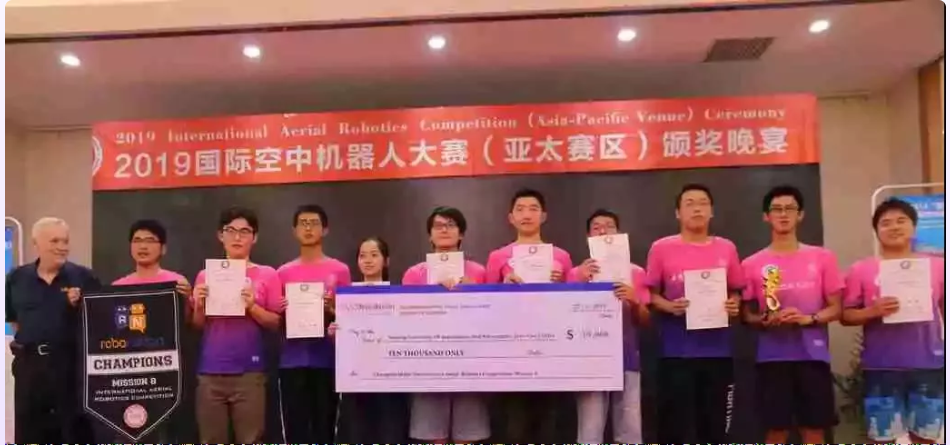 2019年贝博艾弗森代言体育官网零一队在国际空中机器人大赛(亚太赛区)获得佳绩。从包括宾夕法尼亚大学、密歇根大学、清华大学、浙江大学、北京航空航天大学、西北工业大学等在内的5个国家23所高校27支代表队中脱颖而出,夺得全球总冠军,斩获$10,000奖金,创造了南航在该项赛事上历年最好成绩,并成为该赛事自全球举办以来,任务发布一年就完成的首支中国队,与斯坦福大学、卡耐基梅隆大学、柏林工业大学、佐治亚理工学院、麻省理工学院、清华大学、浙江大学等7所世界知名高校共同载入该赛事的光荣史册。