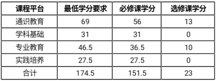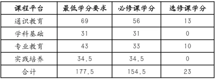 本专业学生在各课程平台中所修读的课程学分数需满足培养方案中各课程平台最低学分要求,在校期间学生需修满174.5学分方可毕业。各课程平台最低学分要求如下: