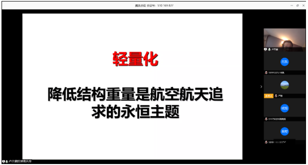 第二个模块,卢天健老师回顾了自己的海外求学经历,又详细介绍了自己的主要研究方向——轻量化,他表示降低结构重量是航空航天追求的永恒主题,并先后介绍了结构轻量化的意义与应用、生物多孔结构。卢老师从20年前开始研究超轻多孔材料和结构,他详细介绍了多孔金属的四个多样化特征和在交通运载工具、航天工程、现代化国防方面的需求,同时,卢老师还介绍了自己的研究思路:立足力学,开展多学科交叉研究,并向大家展示了他带领团队承担的项目情况和取得的主要成绩。第三个模块,卢老师用丰富多样的例子展现了“无处不在的力学”,包括手机触摸屏的力学、微电子力学,还有一些平常难以与力学联合在一起的研究内容,如皮肤热-力-电耦合理论、含液多孔生物材料、神经力学等。卢老师特别指出力学的终极目标是脑科学,而他本人新的研究方向也是大脑的防护力学。一系列介绍颠覆了学生对于力学的传统认知!卢老师表示,他十分注重本科生的培养,并且“晒”出了他指导的本科生进行的研究情况和取得的成就,卢老师鼓励学生勇于挑战,他也欢迎同学们到他的实验室参观,与他交流。最后,卢老师留下了对长空学子的寄语:搏击长空,追梦力学!
