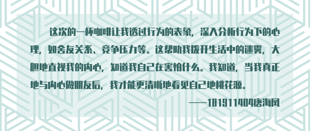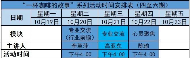 下周的一杯咖啡可谓精彩纷呈,来自专业学院的班主任老师、在中国商飞任职的优秀校友、心理健康教育中心的老师,两大模块,三场活动,总有一场适合你~