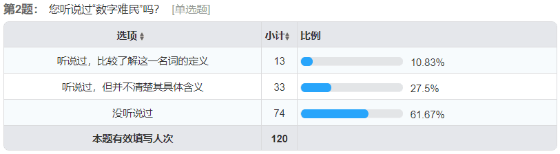由于前期问卷调查采取线上模式,本问卷的受访者集中在18~25岁的人群,在所有被调查者中,大约有10%的人了解这一定义,而超过六成以上的人并未听说过数字难民这一概念,这从一定程度上反映了大众对“数字难民”这一概念比较模糊。