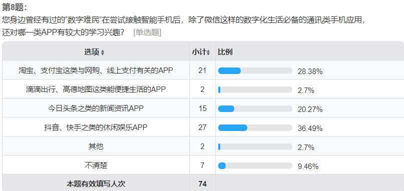 除此之外,对身边的“数字难民”在接触智能手机后尝试学习的APP,有百分之三十不到的受访者认为“数字难民”倾向于学习支付宝、淘宝等于线上支付和网购有关的APP,有百分之二十的人认为他们对今日头条等新闻资讯类APP更感兴趣,还有百分之三十六左右的人认为他们会选择抖音、快手等休闲娱乐类软件。并且,这些“数字难民”多是通过向晚辈以及同龄人学习来熟悉智能手机、尝试融入数字化社会。