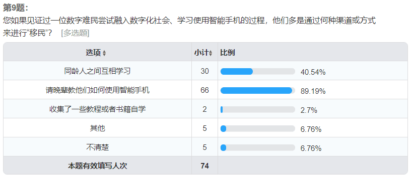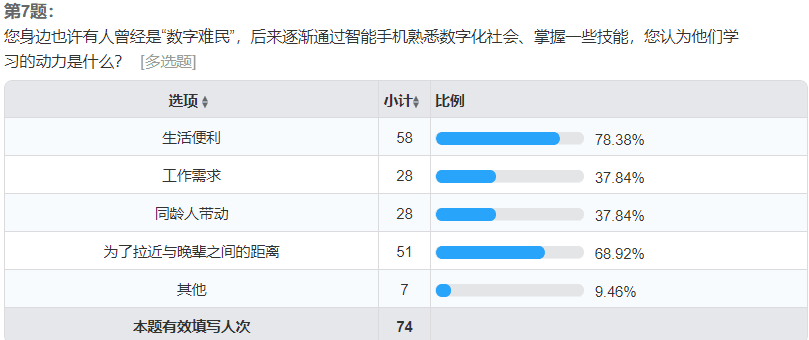 受访者中大部分人认为“数字难民”对以智能手机为媒介的数字文化持以想要融入却不得其法的态度。而对于出现“数字移民”这一现象的解释中,生活便利、工作需要、同龄人带动以及为了拉近与晚辈之间的距离都被认为是可能导致“数字移民”现象发生的原因,其中生活便利的需求和为了拉近与晚辈的距离被更多的受访者视为主要原因。