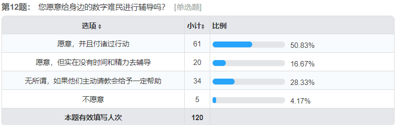 在与“数字难民”的沟通交流这一问题中,有超过一半的人认为他们与数字难民之间存在“鸿沟”,这说明了“数字难民”与数字社会的距离确在某种程度上对生活中的交流沟通产生了影响。并且也有超过一半的受访者认为无法熟练使用智能手机进行聊天、网购、线上支付可以被归为一种“落伍”的表现。但是有一半左右的受访者都表示愿意主动付诸时间和精力对“数字难民”进行辅导;仅有个别受访者认为麻烦或是难度较大而不愿意施以援手。
