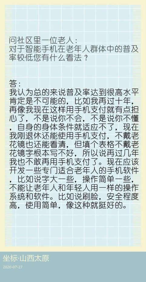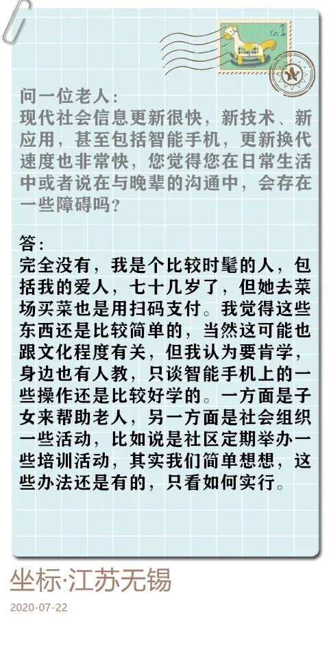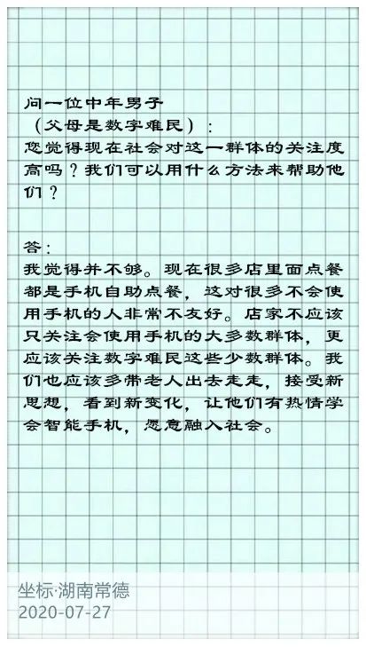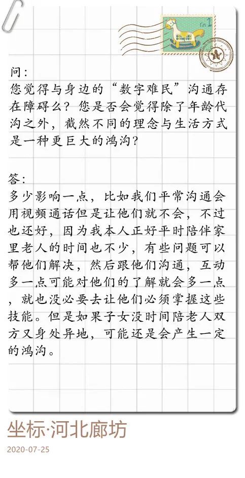 本次采访主要在一座广场中进行,随机采访到了4位路人,从采访信息来看,多数受访者认为家中老人们不适应数字化生活对几代人之间的沟通不会产生太大影响,因为他们还可以采用其他的沟通渠道,受访者都表示他们非常乐意帮助家中的“数字难民”融入数字化社会。