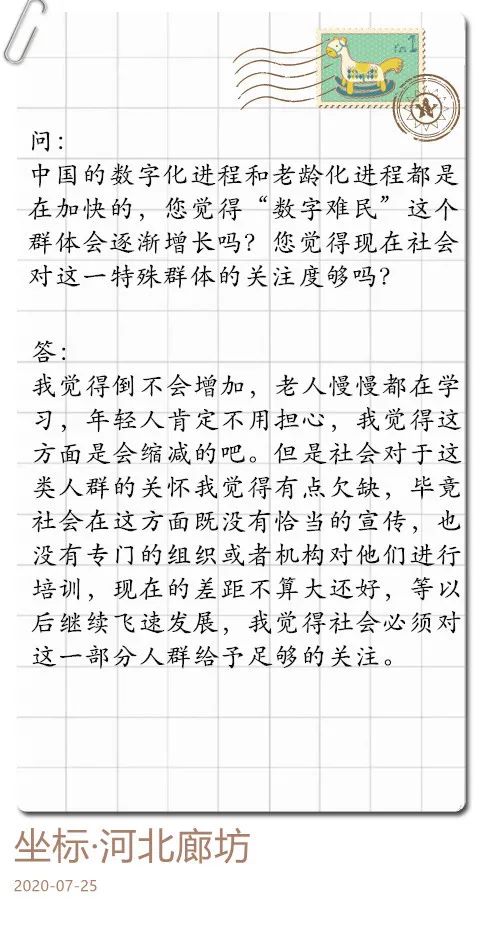 本次采访涵盖了不同年龄和不同职务的的对象,希望通过对社会不同群体的采访,了解社会总体上对数字难民这一概念的认知程度,同时也希望能通过街头采访的方式,让更多人了解数字难民这个群体的存在,并加入到帮助数字难民的行动中。