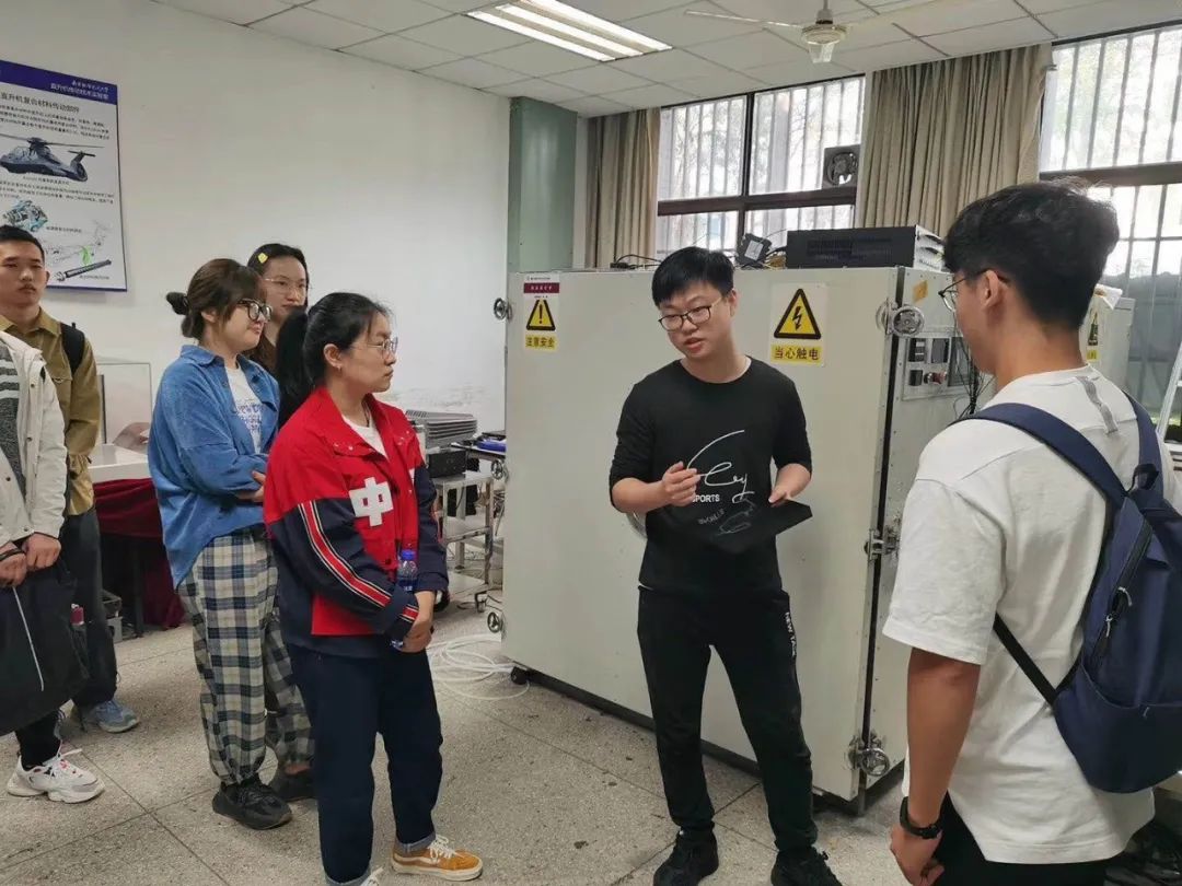 在实验室中,讲解员为同学们详细介绍了两种不同的固化装备:复材传统固化装备与先进微波固化装备,两者分别用不同的原理实现复材固化。前者是利用电阻丝加热空气传导加热复材零件,后者则利用微波直接加热零件,实现高效快速固化。此外,讲解员还为同学介绍了复合材料检测与测试设备,让大家了解如何通过检测与测试研究材料本质属性,提升复材零件质量。