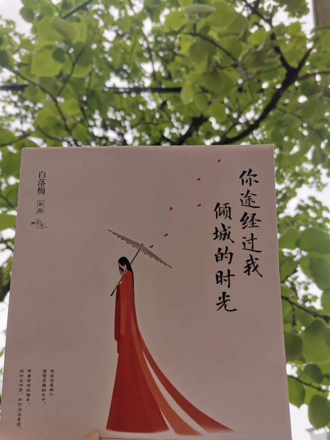 《你途经过我倾城的时光》不同于白落梅的《你若安好便是晴天》那般充斥着民国时期的爱恨情仇。这本书,少了一段浮华,多了一份静美。透过白落梅的文字,我学会了体谅生活。《岁寒三友》、《乌镇年华》、《灵山圣境》……白落梅用一篇篇散文展示了一幅幅风花雪月的图画,讲述了古人诗词背后的漂泊人生。透过她的文字,我体谅了生活的起落,体会到人本平庸的心境。在快节奏的时代里,白落梅的书如同一杯凉开水,让嚣杂的内心变得安静。
