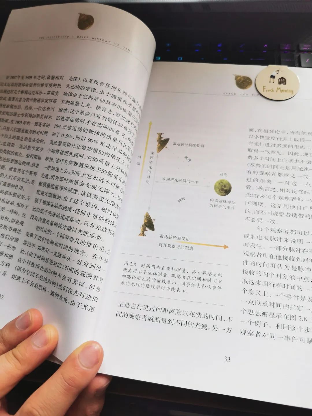 除了这些理论和概念,这本书也为我打开了一扇物理学的大门。就像最近在学的狭义相对论一样,霍金教授用很简明易懂的语言和一些巧妙的插画(就像给每个读者都留下深刻印象的半人马座α一样)将狭义相对论的知识 进行了阐述,让我在接触到课本里的狭义相对论理论时不会显得十分生疏, 那些十分艰涩难懂的文字似乎在经过霍金教授的雕琢后显得容易理解且富有韵味。