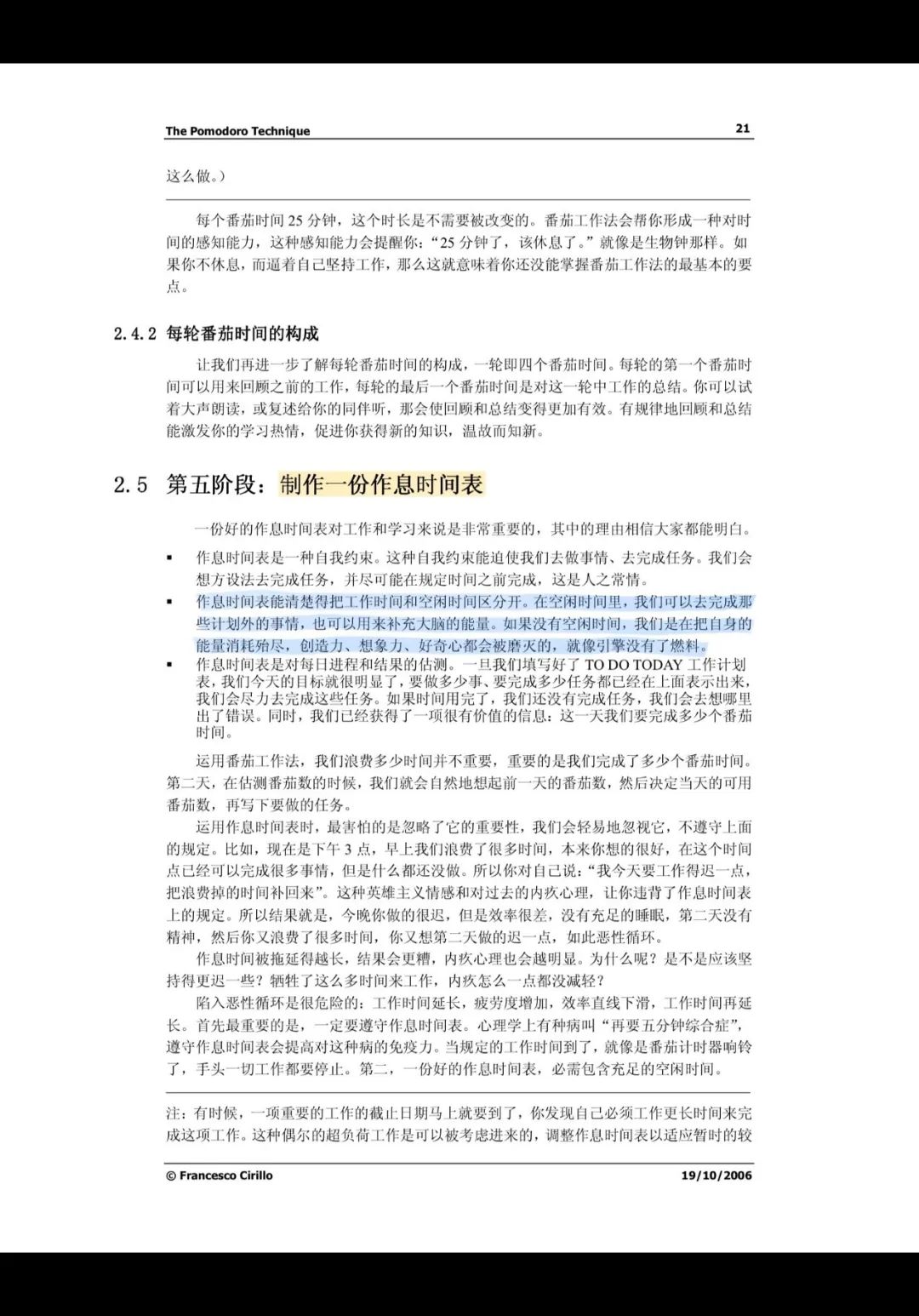 带着这样的疑问继续读下去,我渐渐发现番茄工作法真正的价值在于它的劳逸结合机制。两个“番茄时间”之间必须是断开的,让人们在专注一段时间之后有15到20分钟的休息时间。我觉得这一点反而是人们常常会忽视的。人们总觉得,再给我一些时间,我还可以多做一点,但其实持续工作的时间越久,人的脑子就越糊,效率就越低,再这么工作下去只会让自己的心态越来越差,而工作却进展不大。书中的一段描述很贴切:“作息时间表能清楚地把工作时间和空闲时间区分开来。在空闲时间里,我们可以去完成那些计划外的事情,也可以用来补充大脑的能量。如果没有空闲时间,我们是在把自身的能量消耗殆尽,创造力、想象力、好奇心都会被磨灭的,就像引擎没有了燃料”。