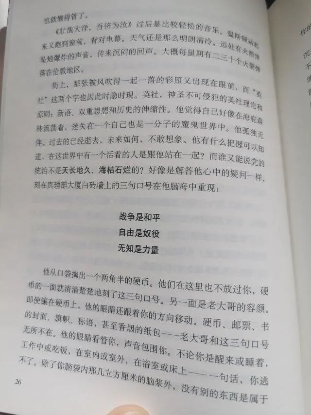 记得初读此书时,感觉艰涩难懂,随着所读篇幅的增多,便越发感觉一种恐惧自内而生。而今回顾,在那样一个部门名字与所行之事完全相悖的政党的统治下是何其可怕。真理部负责编造谎言篡改历史,富裕部负责掩盖贫穷的事实,和平部负责战争事务,仁爱部负责“疼爱”那些犯了罪的人。我们总是说“以史为鉴,可以知兴替”,可是,在大洋国里,历史不是一面镜子,而是黑板上的记号,可以随时擦去,随时填补。更为可怕的是,一旦涂改了,你找不到证据去证明这是篡改历史的行为。