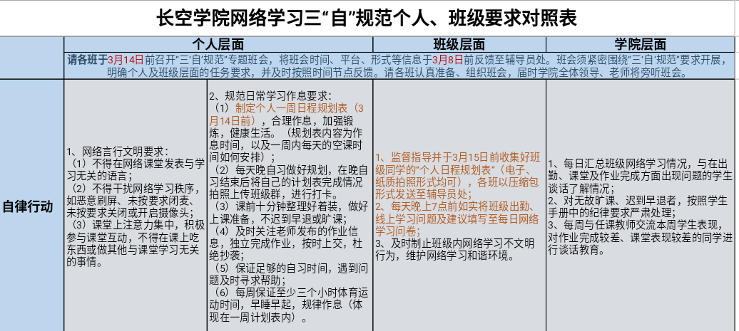 学院制作“三自”规范表,分别从学院、班级、个人层面细化各项要求,做出针对性指导。