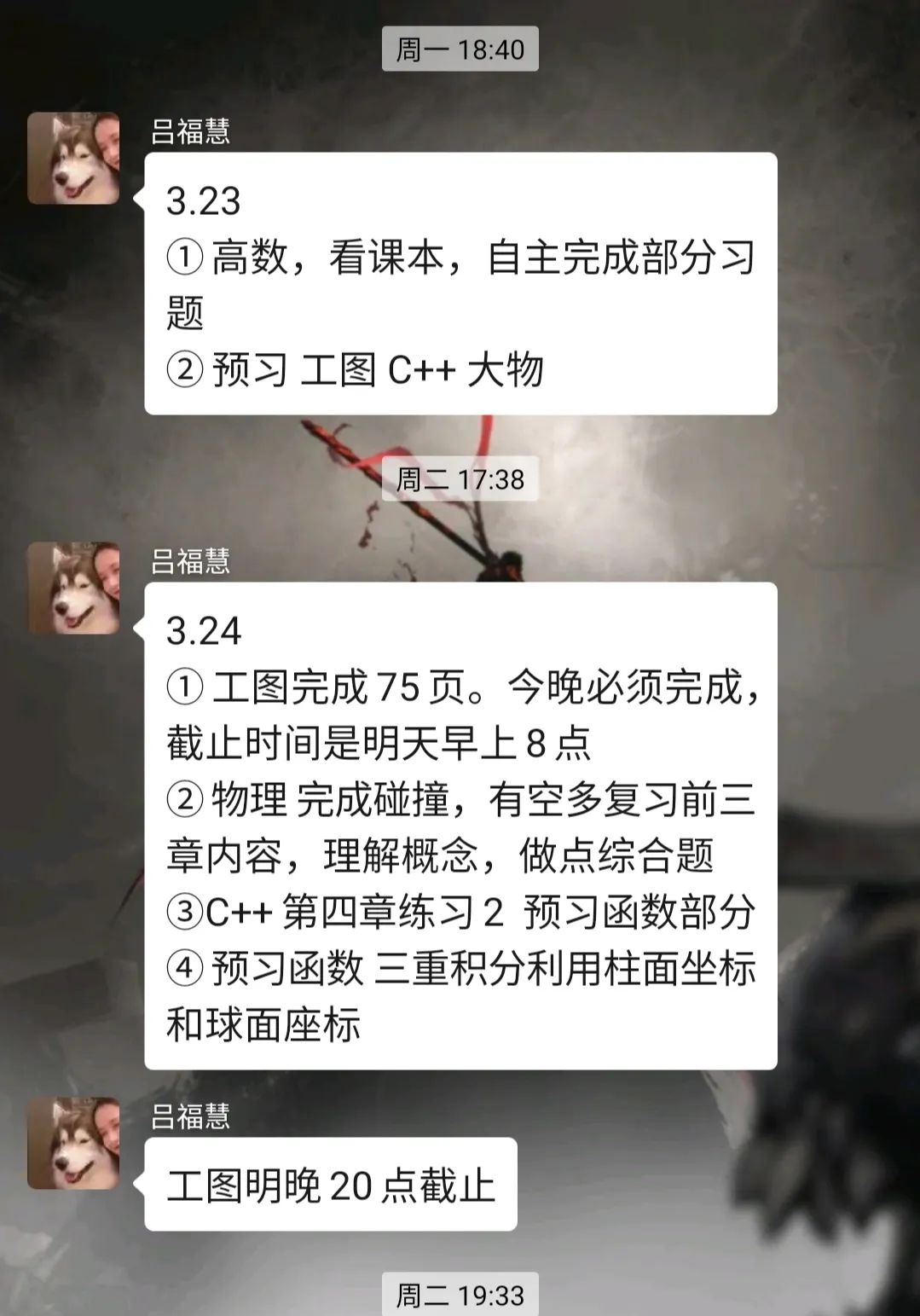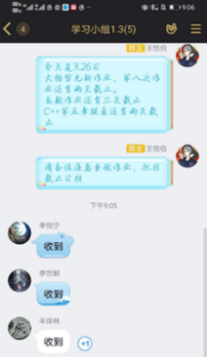 101、113、122班学习小组组长每日定时发布通知,小到每日作业安排,大到组内学习计划,同时关注组员们的作业提交情况,保证每名组员有条不紊地进行线上学习。