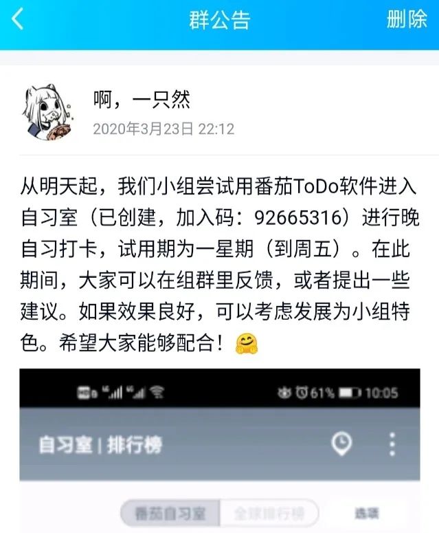 105、121班学习小组尝试使用“番茄ToDo”app开展自习,通过对自习室功能的充分探索,灵活使用,将其发展成小组学习特色。