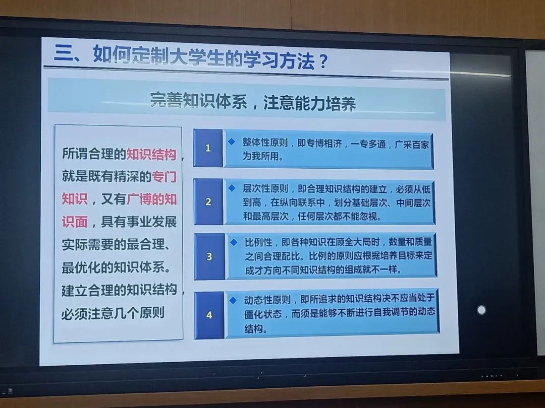 首先,陈谋教授以大学与高中学习特点的不同之处引入,提出了大学需要培养思维、创新和管理能力。同时,大学作为社会的缩影,交际表达能力也不可或缺。从不同时期学习条件的对比及自身经历中,陈谋教授提出我们不仅仅要课堂上认真听讲,更应当合理利用生活中的空余时间,及早规划人生目标,用明确的目标来激励自己,同时锻炼自主学习能力。