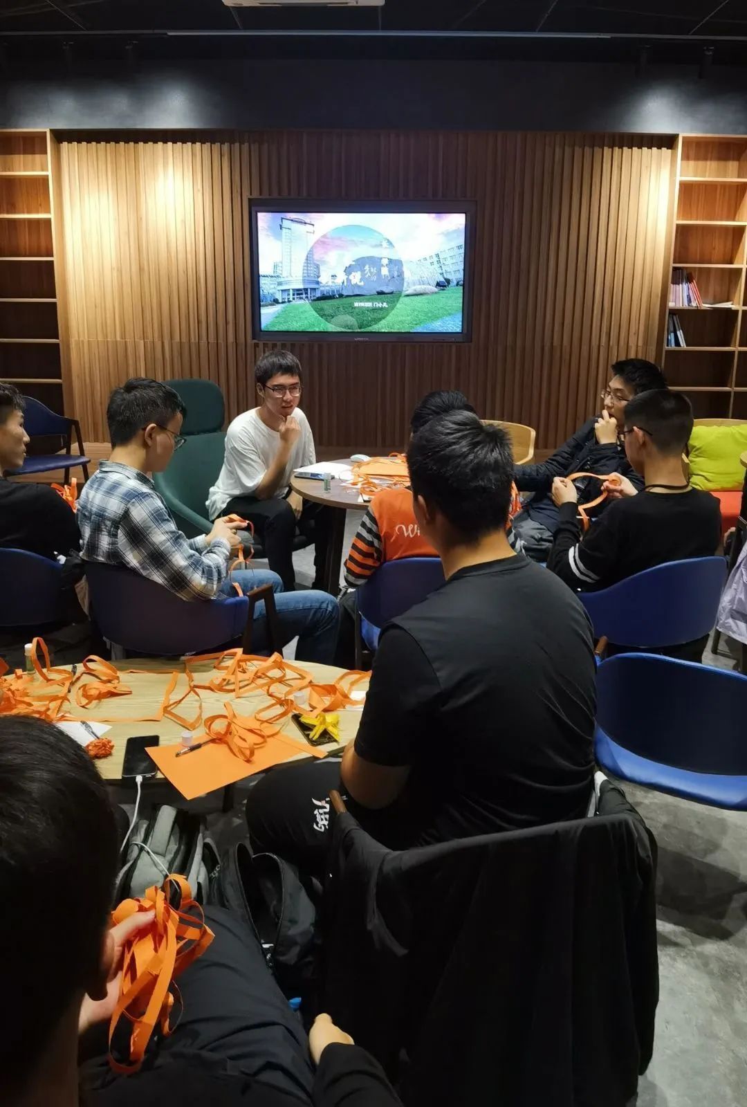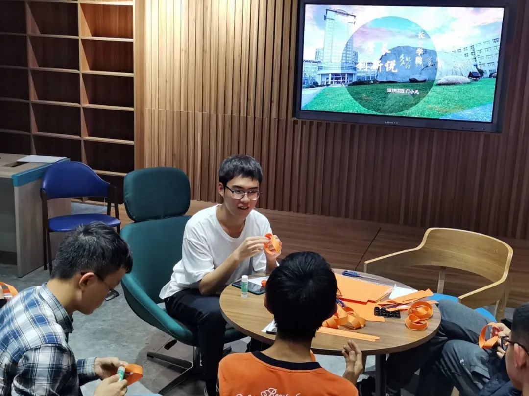 活动开场,门小凡学长领着大家一起制作“莫比乌斯环”,一个个纸环在剪刀飞舞下绽放出来。在课本上显得十分遥远的莫比乌斯环竟然轻轻松松就被自己动手做出来了,在场的同学们都十分惊奇和欣喜,这让大家很快放下拘束,开始和学长交流起来。