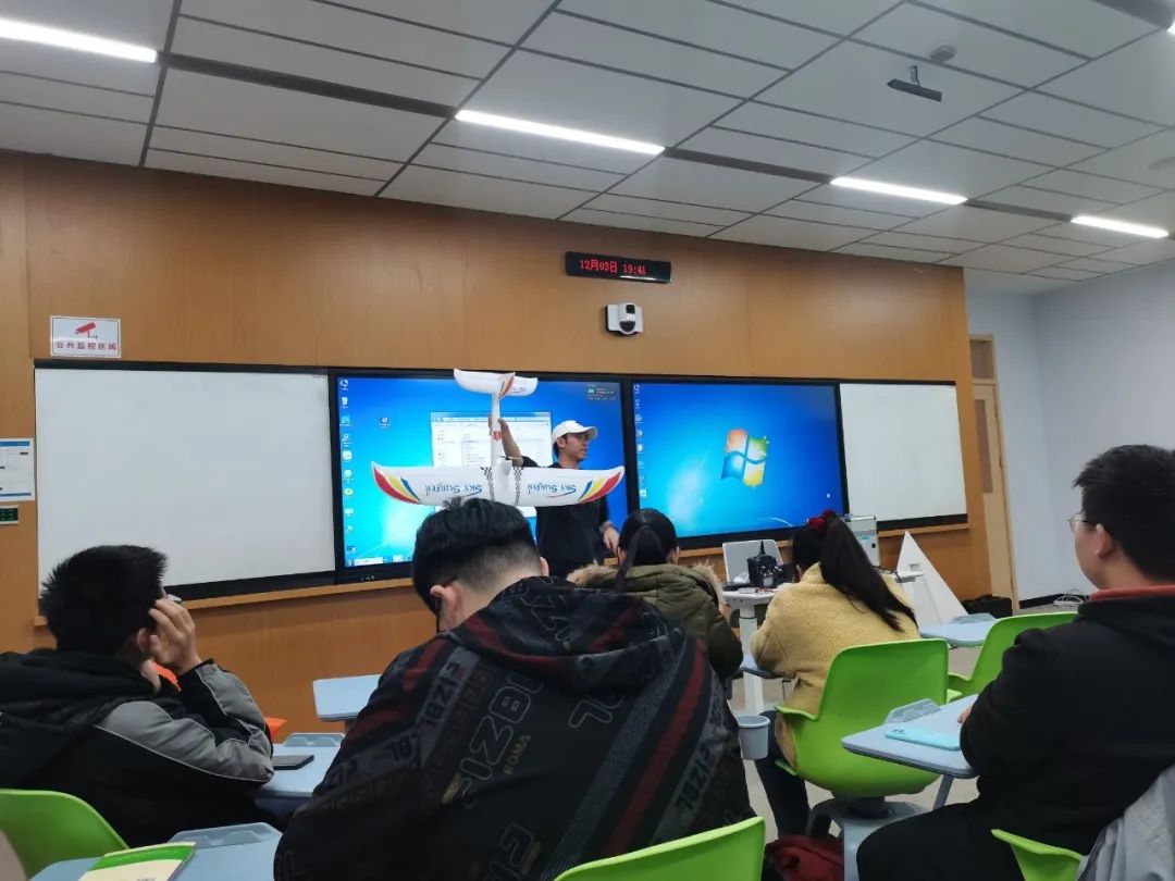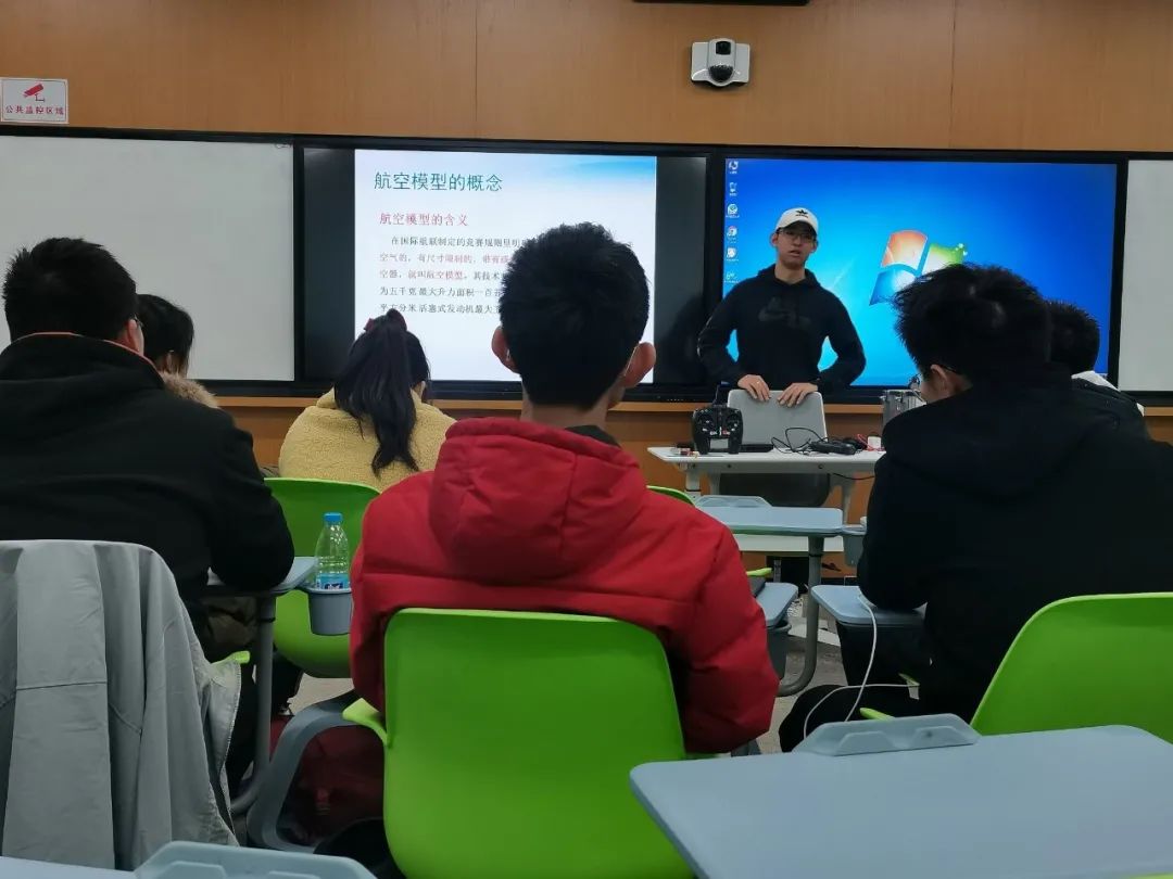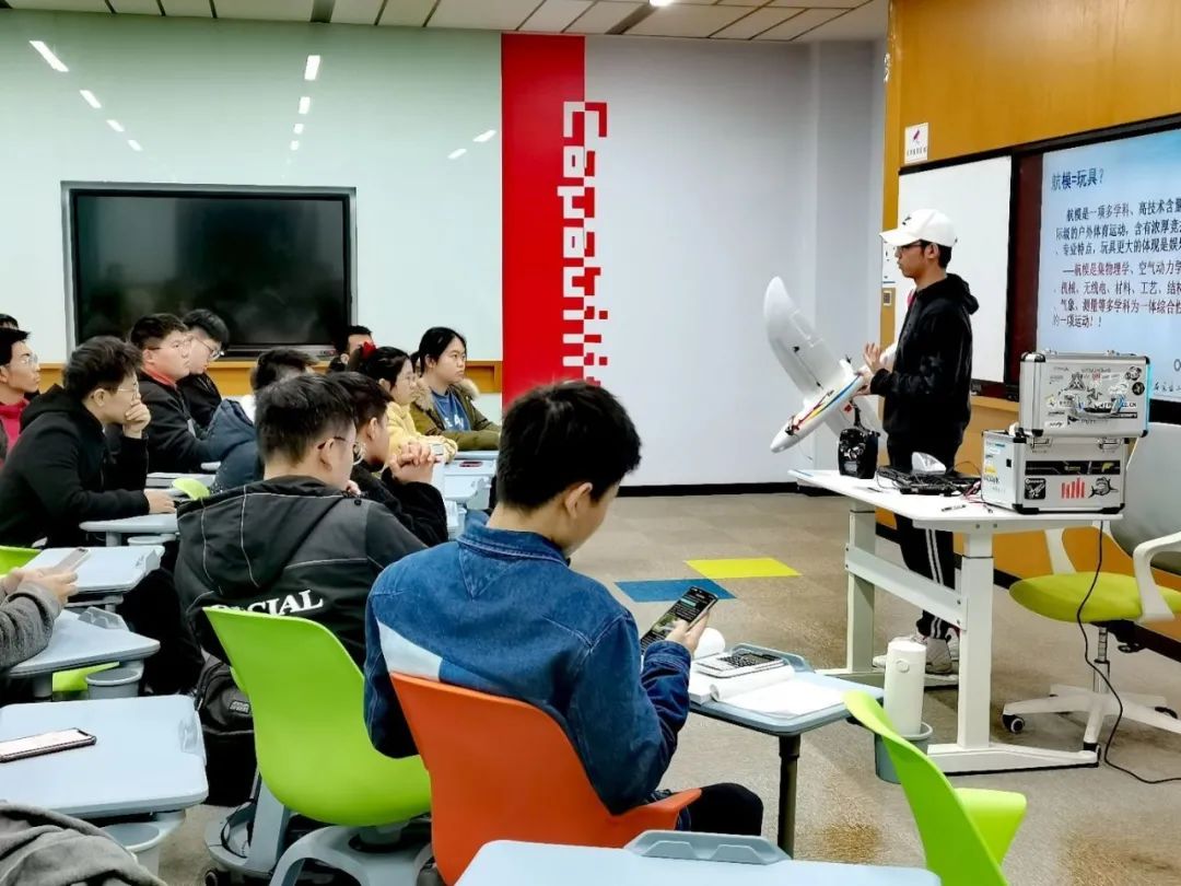 接着,邹佳均具体介绍了航模的相关知识。“航模重于空气,有尺寸限制。”他说到,“航模运动相较于其他运动而言并不是特别耗费体力,但可能需要更多的脑力和资金,并且需要有较多的知识与扎实的基础。”邹佳均将航模与无人机进行对比,指出它们基本的区别的区别在于是否有导航飞控系统,能否实现自主飞行等。通俗来说,无人机可以实现自主飞行,而航模不可以,必须由人通过遥控器来控制。也就是说,无人机自身携带了“大脑”飞行,可能“大脑”受限于人工智能,没有人脑灵光,但是航模的“大脑”始终在操纵人员的手上,这就使航模具备了一些区别于无人机的特点。
