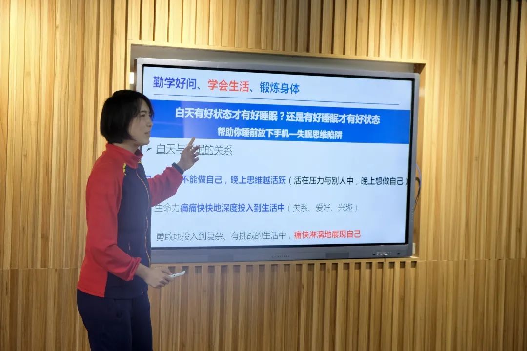 那么,何为健康的生活方式?俗话说:“七分吃,三分练”,养成健康的生活方式,健康的饮食摄入必不可少。张老师建议同学们全面摄入七大营养素,多吃家常推荐的食物,减少加工食品摄入,定期进行肠道清洁饮食。她说:“挑选好增强体质、提高精力、改善身体功能的食物,能让身体细胞成为富翁,可以为所欲为。” 接着,张老师通过辨析“失眠思维陷阱”进而强调睡眠的重要性。针对“失眠人群”不断扩大这一现象,张老师告诉大家,不敢让思维停下来是引发失眠的重要原因。白天的焦虑或是后悔让晚上的自己不断胡思乱想或是自我批评,在大脑中一遍遍的推演着各种冲突问题的发展,不让思维停下,导致思维体验的发达与实践体验的缺失之间的强烈冲突,从而诱发阿尔茨海默症。