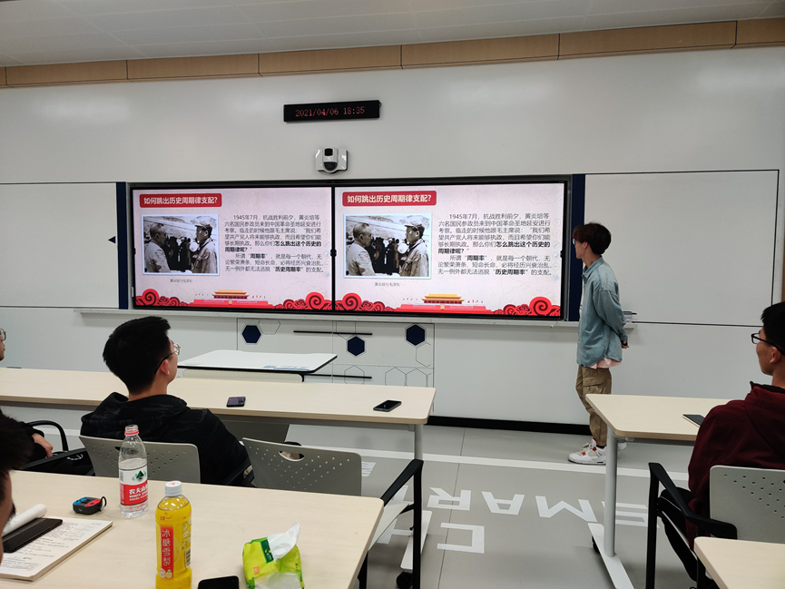 张天毅同学围绕这两问表达了自己的观点。“历史周期律”揭示的是执政者在政治舞台上的盛衰兴亡、变换更替,是人类社会发展过程中客观存在的一条规律。共产党领导的这块土地政治清明、军民团结、上下一心。这是民族的希望,也是中国的未来。回顾解放区民主选举,农民投豆选举,按选举法,每个人都要对选民发表竞选演说,人声鼎沸,唇枪舌战,仿佛这是时空上演的一幕微电影,我们坐在时空的另一头,观看品鉴,感触颇深。时间已然走过七十余年,解放区的民主选举,完美地佐证了历史,亦见证了后世风云,当它映入眼帘时,我们定会心生感慨:中国共产党人始终与人民站在一起的重要法宝——“民主,让人民来监督政府”这一简单而又深刻的道理。21世纪,我们的国家从未改变过这种初心和使命,我辈接班人也必须肩负这样的使命。