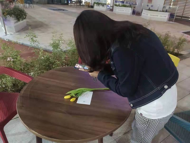 5月20日,一个不是节日却胜似节日的日子,人们往往会用一束花来表达对他人的爱意。借本次活动的机会,我也希望给遥远的她一束花来表达我的思念。于是,在我的多番寻找下,在三楼椅子处发现了这束郁金香。虽然我不能亲手给她送过去,但是给她拍了照片,并将花放在了水杯里。