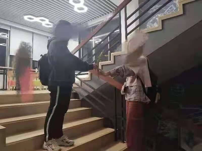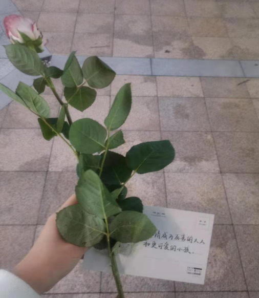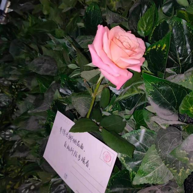 众里寻花千百度,蓦然回首那花却在灯火栏杆处——这就是我院楼寻花最大的感受。5月20早上,我早早来到了院楼,想要找到一朵娇艳的玫瑰花送给小姐妹,想让她知道,虽然可能没有男生给她送花,但她还有我啊。一开始我以为他们会把花藏在非常隐秘的地方,结果就往那些角落旮旯钻,闷头一通好找,眼睛都瞪大了,但是又怎么会找到呢,那些花花早就被同学们“搜刮”走了,找了半天一朵花也没看到。正当我垂头丧气准备离开时,余光却瞥到旁边的栏杆和墙壁的缝隙处斜斜地放着一朵粉色的玫瑰,它仿佛在跟我说:别丧气,你终于找到我啦!很感谢心站的活动,让我和我的姐妹都感受到了520的浪漫!