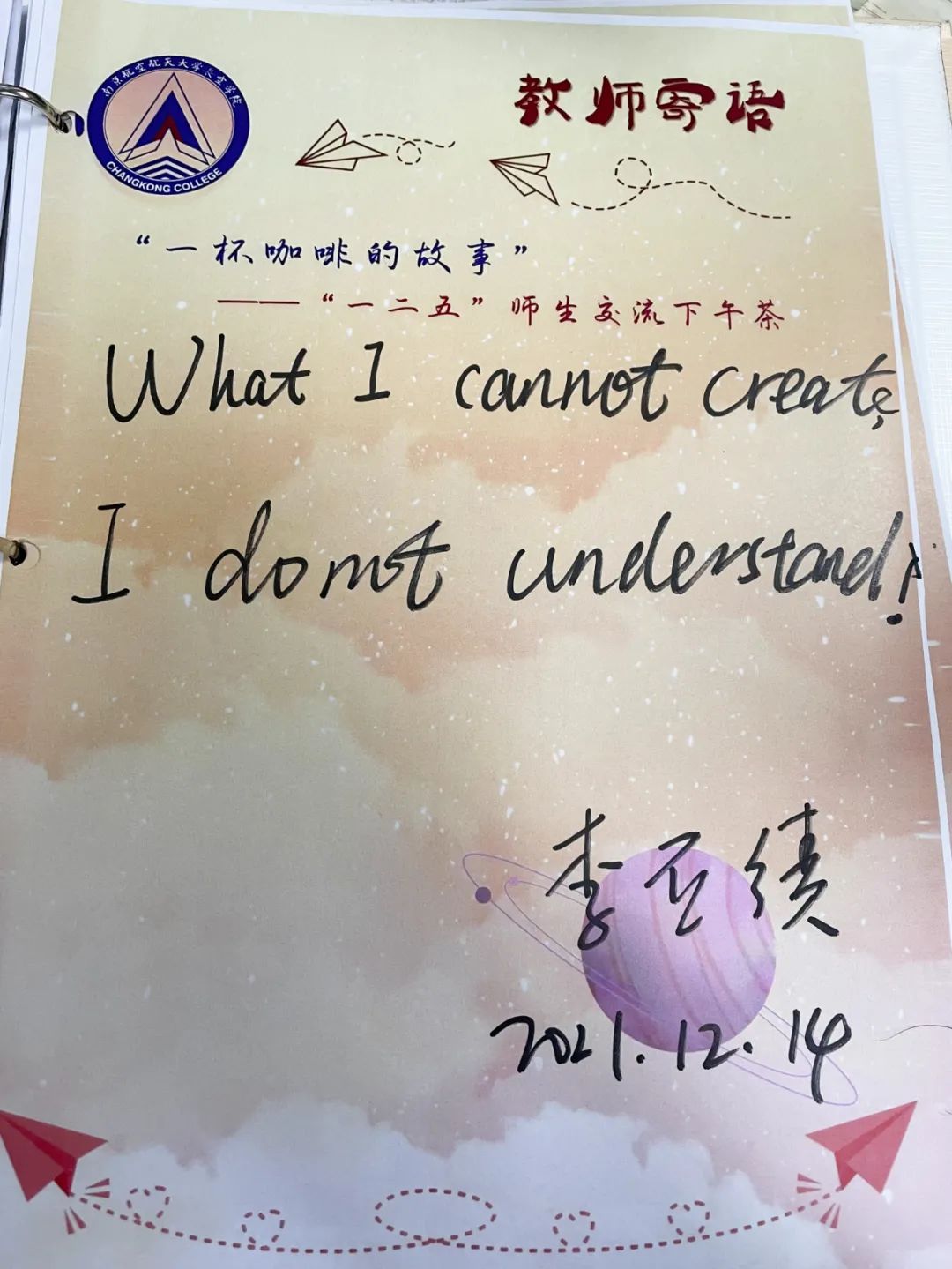 在这次“一杯咖啡的故事”中,我们了解到了李老师学习、生活和工作的经历,也从中感悟到要多与外界接触、开拓自身的眼界,更需要认真对待学业,打好基础、充实自我。