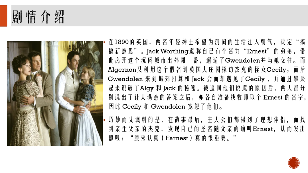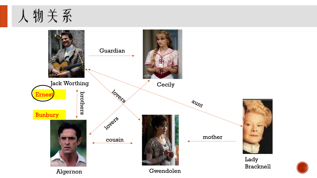 王老师以世界读书日为引,以幽默的方式带我们回忆起了伟大的戏剧家——莎士比亚,而奥斯卡·王尔德正是莎士比亚最好的传承者之一。王老师向同学们介绍了这位爱尔兰剧作家,并列举了几条“王氏语录”让大家翻译,以体验王尔德语言中的睿智与诙谐,并以一张人物关系图,带着同学们简单了解了《认真的重要性》中复杂、戏剧性的人物关系,并以轻松幽默的语言,概括了故事情节。