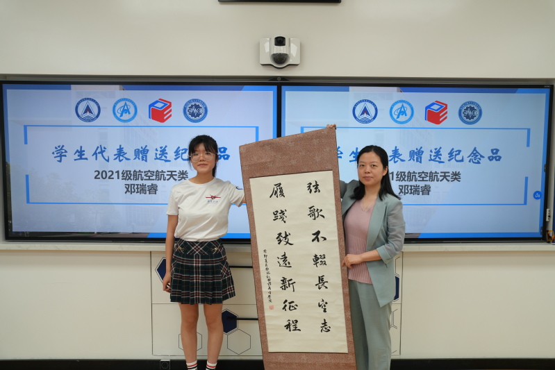 2021级航空航天类专业学生、校书法协会会长邓瑞睿在分流之际,手写一副卷轴赠送给长空,“弦歌不辍长空志,履践致远新征程”,以期长空学子注重实践,知行合一,理论联系实际,在未来锐意进取,开拓创新。贝博艾弗森代言体育官网副院长彭聪代表学院接受该书法赠品。