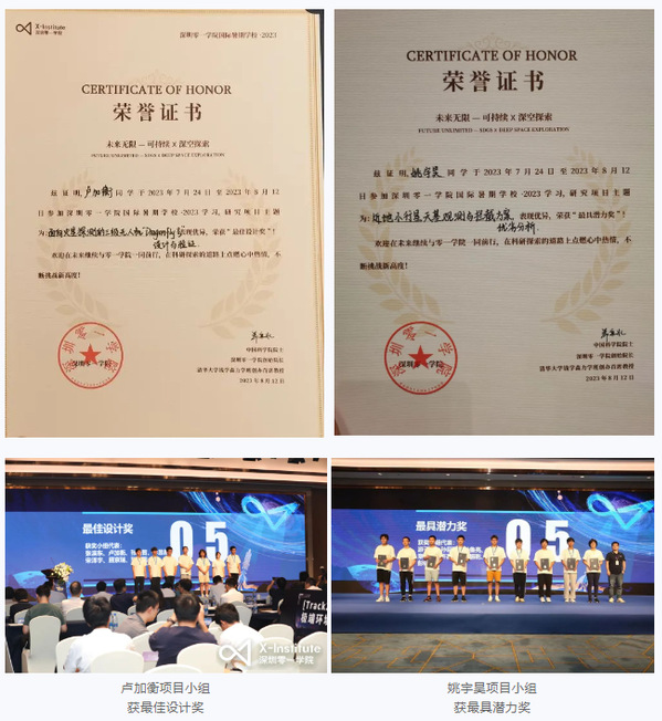 8月12日,深圳零一学院国际暑期学校结营仪式圆满举行。陈晓东院士、贺福初院士、林间院士、张晓平院士、赵振堂院士、郑泉水院士、钱致榕教授、王田苗教授等权威专家线下,郭东明院士、胡海岩院士、杨军院士、张丹院士等线上共同聆听零一学院暑校学生创新项目汇报、参观海报展览、颁奖优秀项目,为现场X型学生迸发的创意创新频频点赞。长空学子表现优异,卢加衡同学小组的“面向火星探测的三级无人机‘Dragonfly号’设计与验证”项目小组获得最佳设计奖,姚宇昊小组的“近地小行星天基观测与拦截方案优劣分析”项目获得最具潜力奖。