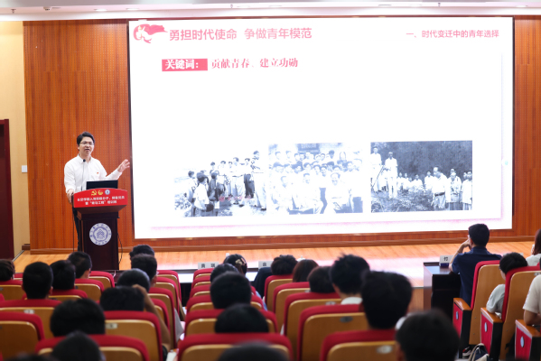 校学生处副处长佘明主讲《勇担时代使命,争做青年模范》主题党课。佘明以各个时代的青年先锋引入,深入解读时代使命的内涵,强调青年学子在新时代中应肩负的责任和使命,并寄语培训班学员要有远大的理想和坚定的信念,勇于担当,敢于创新,为实现中华民族伟大复兴的中国梦贡献青春力量。